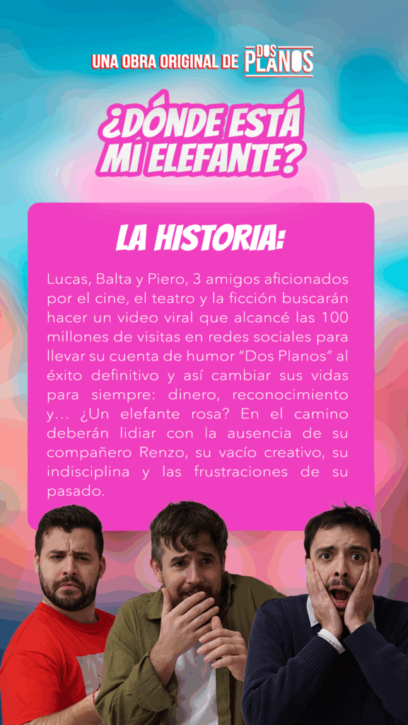 Lucas, Balta y Piero, 3 amigos aficionados por el cine, el teatro y la ficción buscarán hacer un video viral que alcancé las 100 millones de visitas en redes sociales para llevar su cuenta de humor “Dos Planos” al éxito definitivo y así cambiar sus vidas para siempre: dinero, reconocimiento y… ¿Un elefante rosa? En el camino deberán lidiar con la ausencia de su compañero Renzo, su vacío creativo, su indisciplina y las frustraciones de su pasado.